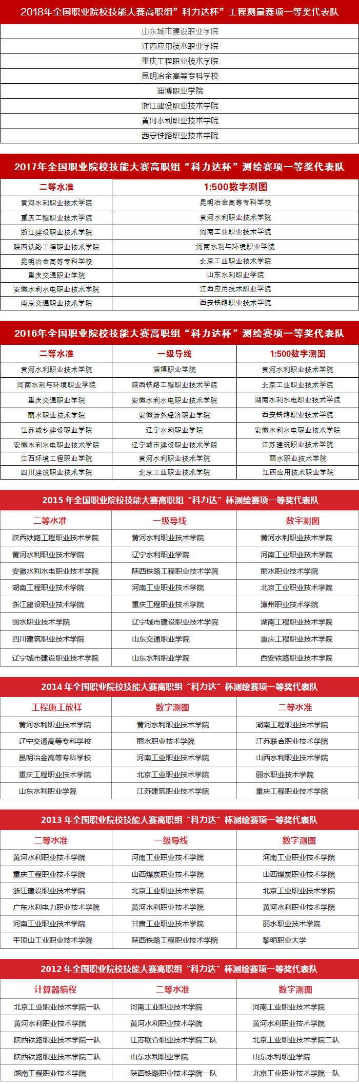全國職業技能大賽由31個部委主辦,包括15個大類,分爲98個競賽項目,其中全國職業院校技能大賽高職組測繪競賽(以下簡稱“大賽”)作爲其中一個分項,是測繪地理信息職業教育領域規格最高、水平最高、參與範圍最廣的一項賽事。自2012年以來,科力達已經連續四年總冠名并贊助大賽賽項,今年是第五個年頭。